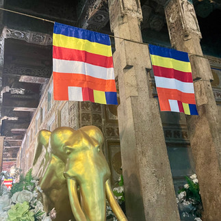 One cannot see the actual tooth when you emerge into the sanctum where it is held - only the beautiful shrine itself. There are videos playing, showing ceremonies taking place around the shrine and music fills the air from the gata bera and the yak bera drums, the Horanawa flute and the tiny cymbals, all creating a joyful atmosphere. The fluttering prayer flags also contribute to the colour of ceremonies here, and indeed in the streets.